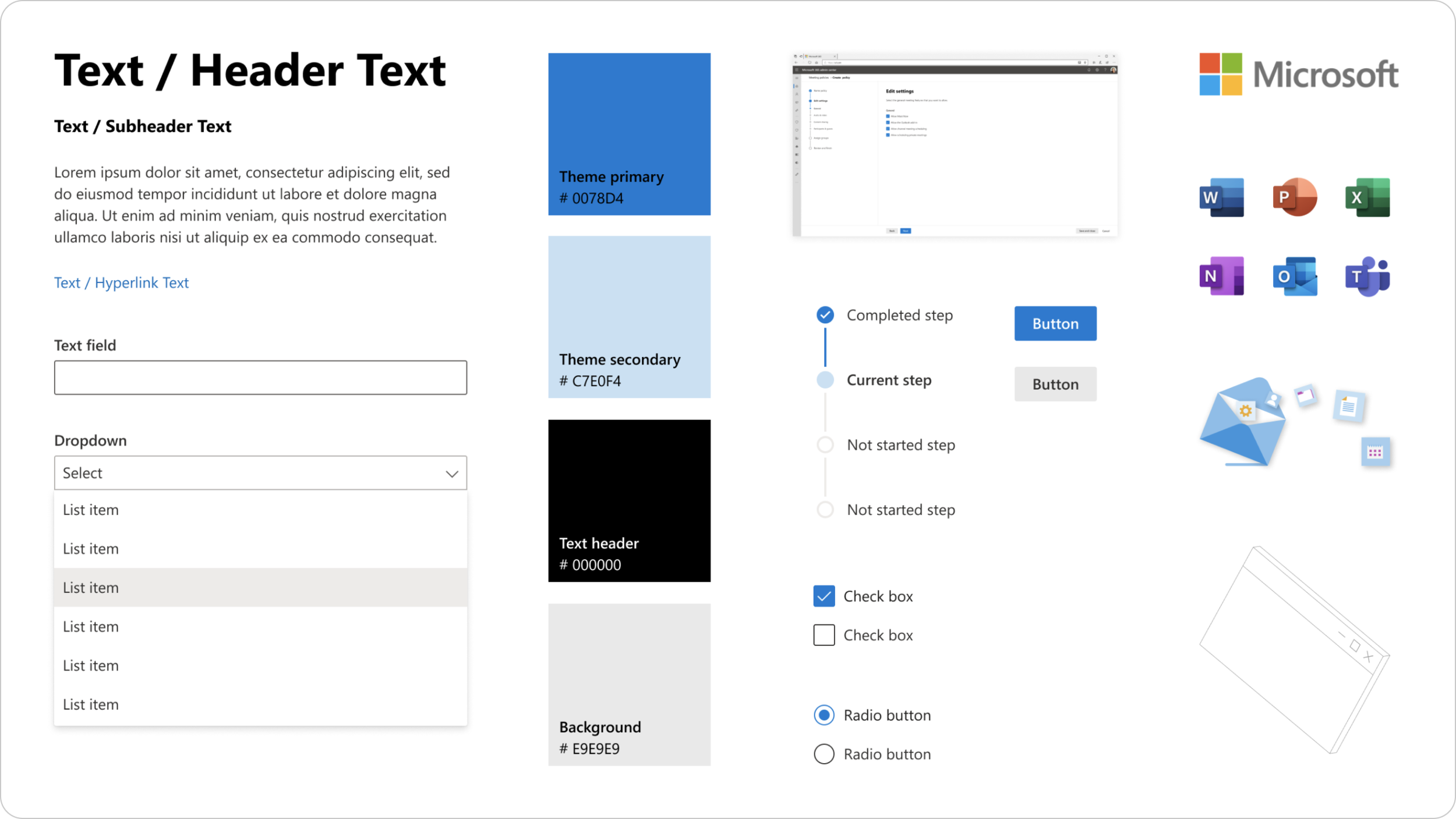 A coherent design guide was important to this effort because we had to bridge three different experiences and they each had their own design patterns. We decided to integrated graphics and theme colors from marketing (awareness) and Admin Center (setup). In order for sign-up to feel coherent with setup, we utilized the Admin Center and Fluent design controls.